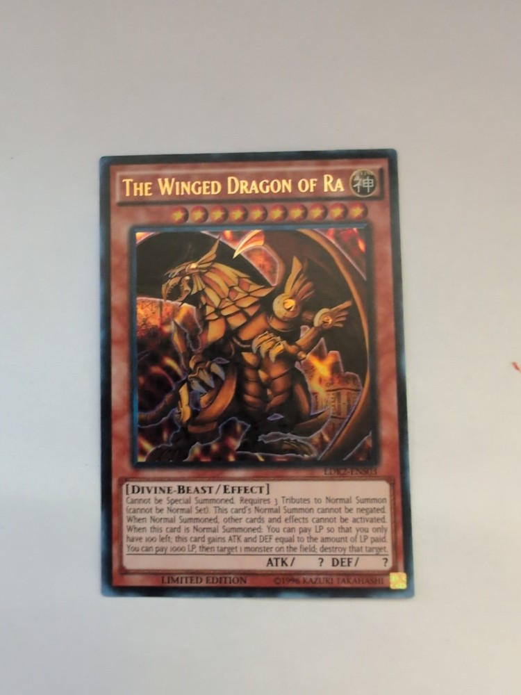 The product is a Yu-Gi-Oh! TCG card featuring "The Winged Dragon of Ra" from the set "Legendary Decks II." It is a Limited Edition Ultra Rare Holo card with a Divine-Beast theme, illustrated by Deviant Art and manufactured by Konami. The card is in English language and is suitable for ages 4 and up. This collectible card game item is a sought-after piece for fans of the Yu-Gi-Oh! franchise, specifically those who collect cards featuring characters like Yami Yugi and Yami Marik.