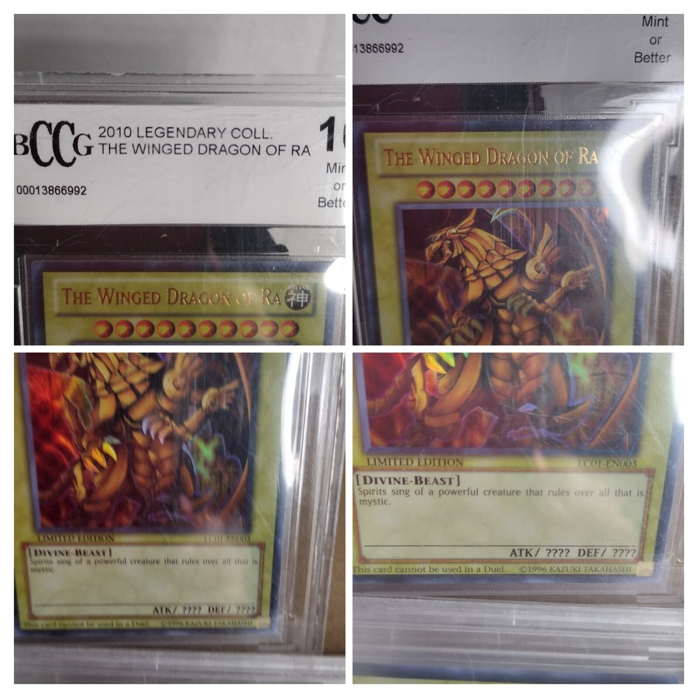 Own a piece of Yu-Gi-Oh! history with this ultra-rare The Winged Dragon of Ra Egyptian God Monster card from the Legendary Collection 1 set. Graded a perfect 10 by Beckett Collectors Club Grading (BCCG), this card is sure to be a prized addition to any collection. The holographic finish and English language make it a must-have for fans of the Yu-Gi-Oh! TCG. This card is certified with number 0001366991 and is ideal for collectors who value rarity and quality. Card certification #'s 00031866991 00031866868 00013866992l All sales final...