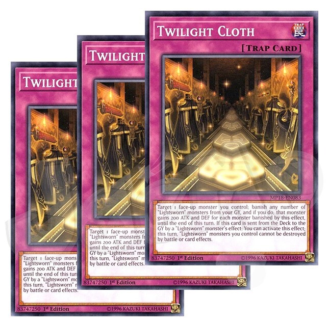 Twilight Cloth x 3 1st Edition You will received 3 cards are they are in NM condition. Also will include a free Holographic card which can be a rarity of Super, Ultra, Secret, etc! Card Information Target 1 face-up monster you control; banish any number of "Lightsworn" monsters from your GY, and if you do, that monster gains 200 ATK and DEF for each monster banished by this effect, until the end of this turn. If this card is sent from the Deck to the GY by a "Lightsworn" monster's effect: You can activate this effect; this turn, "Lightsworn" monsters you control cannot be destroyed by battle or card effects. Number: MP18-EN083 Rarity: Common