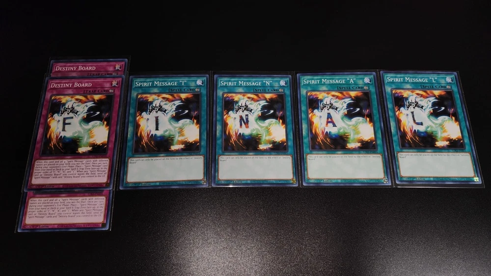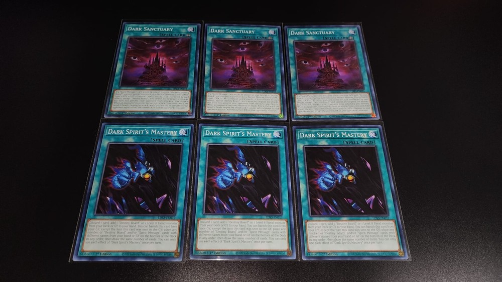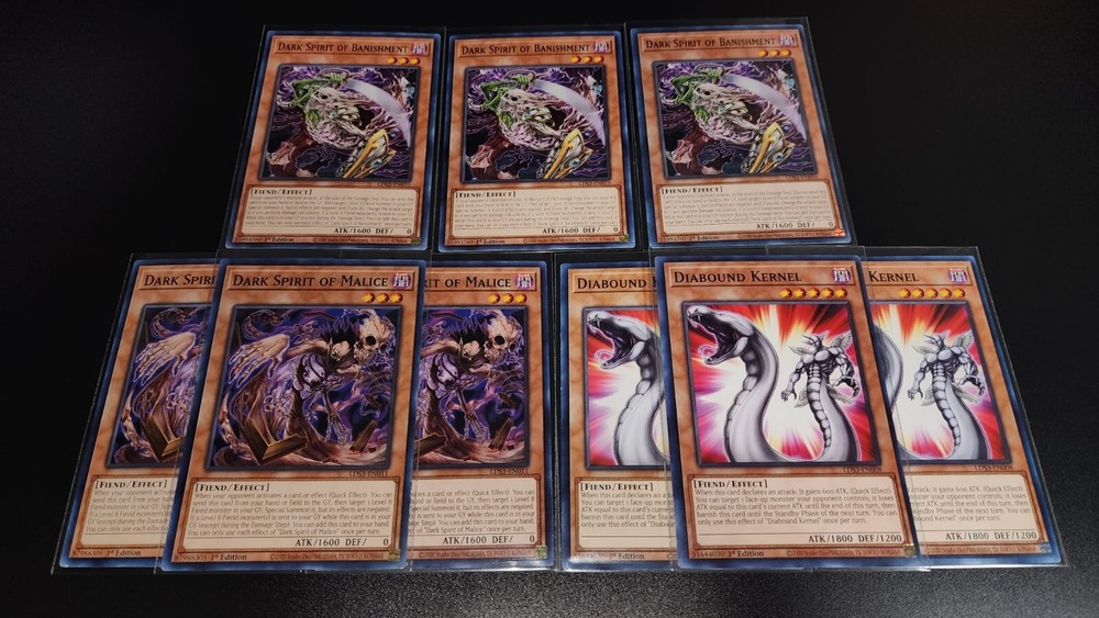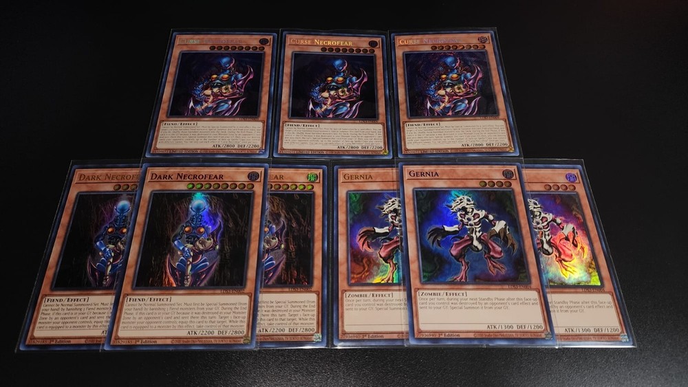YuGiOh Yami Bakura Deck Collection 42 Card Destiny Board Curse Dark Necrofear Monsters 3x Cursed Necrofear (secret rare) 3x Gernia (Red Blue Gold Ultra rare) 3x Dark Necrofear (Red or gold ultra rare) 3x Dark Spirit of Banishment 3x Dark Spirit of malice 3x Diabound Kernel 3x Doomcaliber Knight 2x Jowgen The Spiritualist SPELL 3x Dark Sanctuary 3x Dark Spirit's Mastery 3x Destiny Board 1x Spirit Message "I" 1x Spirit Message "N" 1x Spirit Message "A" 1x Spirit Message "L" TRAP 3x Zoma The Spirit 3x Sentence Of Doom You will receive every card that pictures show! bid with confidence. **Sleeves not Included**