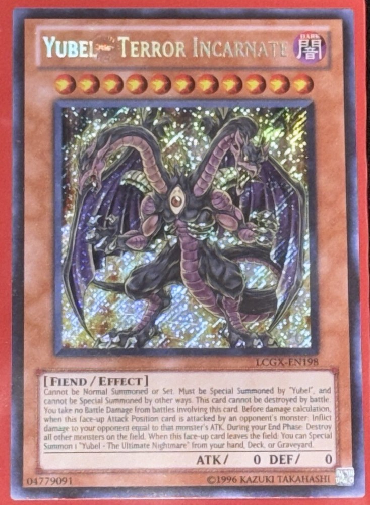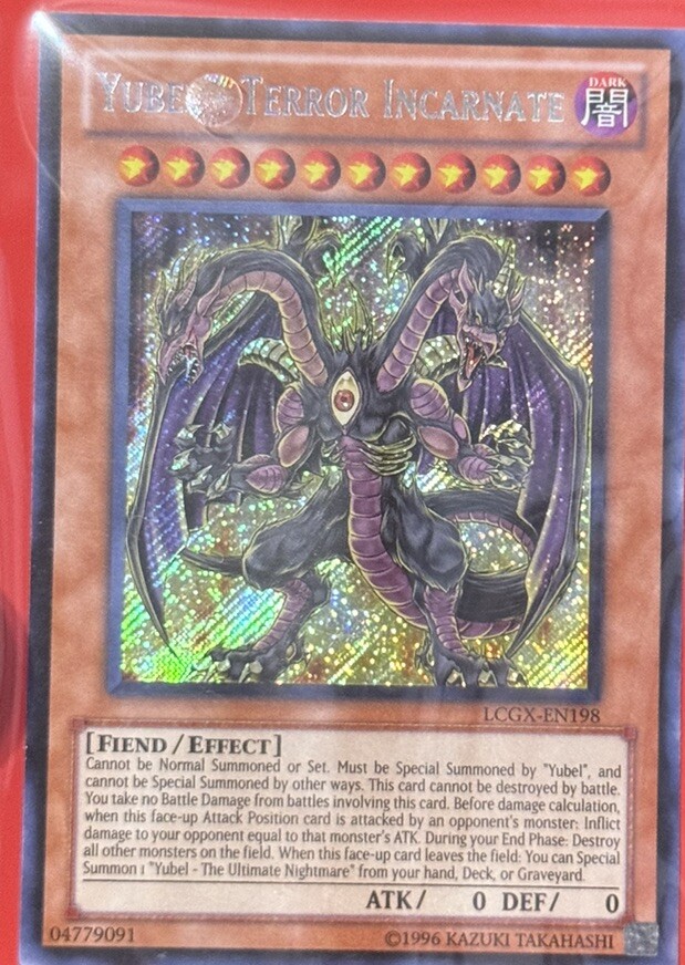 This Yu-Gi-Oh! trading card features the character Yubel in her Terror Incarnate form. The card is a Secret Rare with a Holo finish, and has the card number LCGX-EN198 in the Legendary Collection 2 set. It is a standard size card made of card stock, and is in mint/near-mint condition. The Yubel - Terror Incarnate card is an Effect type with an Attack/Power of 0 and Defense/Toughness of 0. It is suitable for children aged 6 and up, and is in English language. This card is perfect for collectors of Yu-Gi-Oh! TCG and fans of the character Yubel, and the show YUGIOH GX! Also this card will come with sleeves, and extra cards that will also be for free and with sleeves.
