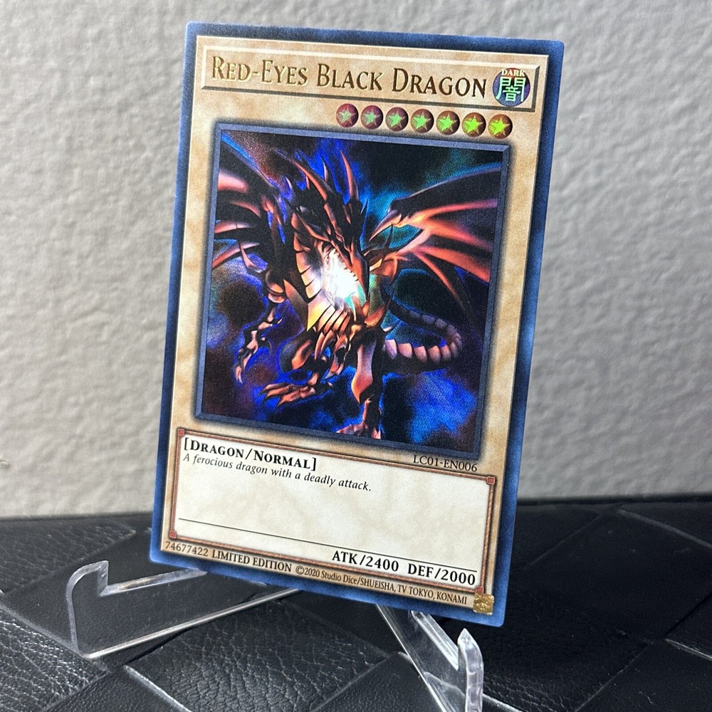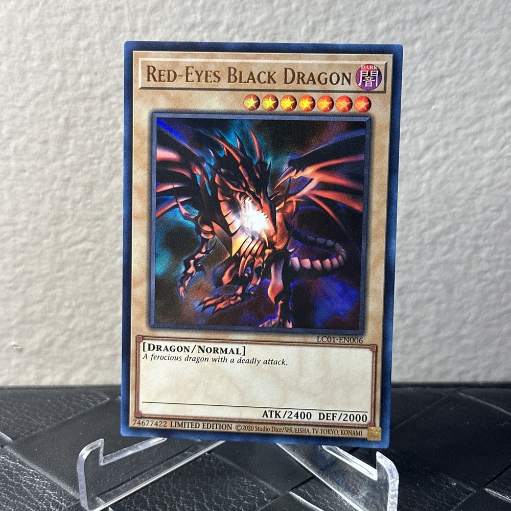 Experience the ultimate power of the Red-Eyes Black Dragon in this limited edition Yu-Gi-Oh! TCG card from the Legendary Collection set. This Ultra Rare monster card manufactured by Konami features a 1st edition status and is in excellent condition, having been lightly played. The card belongs to the Yu-Gi-Oh! character family and is in English language. It is perfect for collectors and enthusiasts of the collectible card games. Don't miss the opportunity to add this highly sought-after card to your collection.