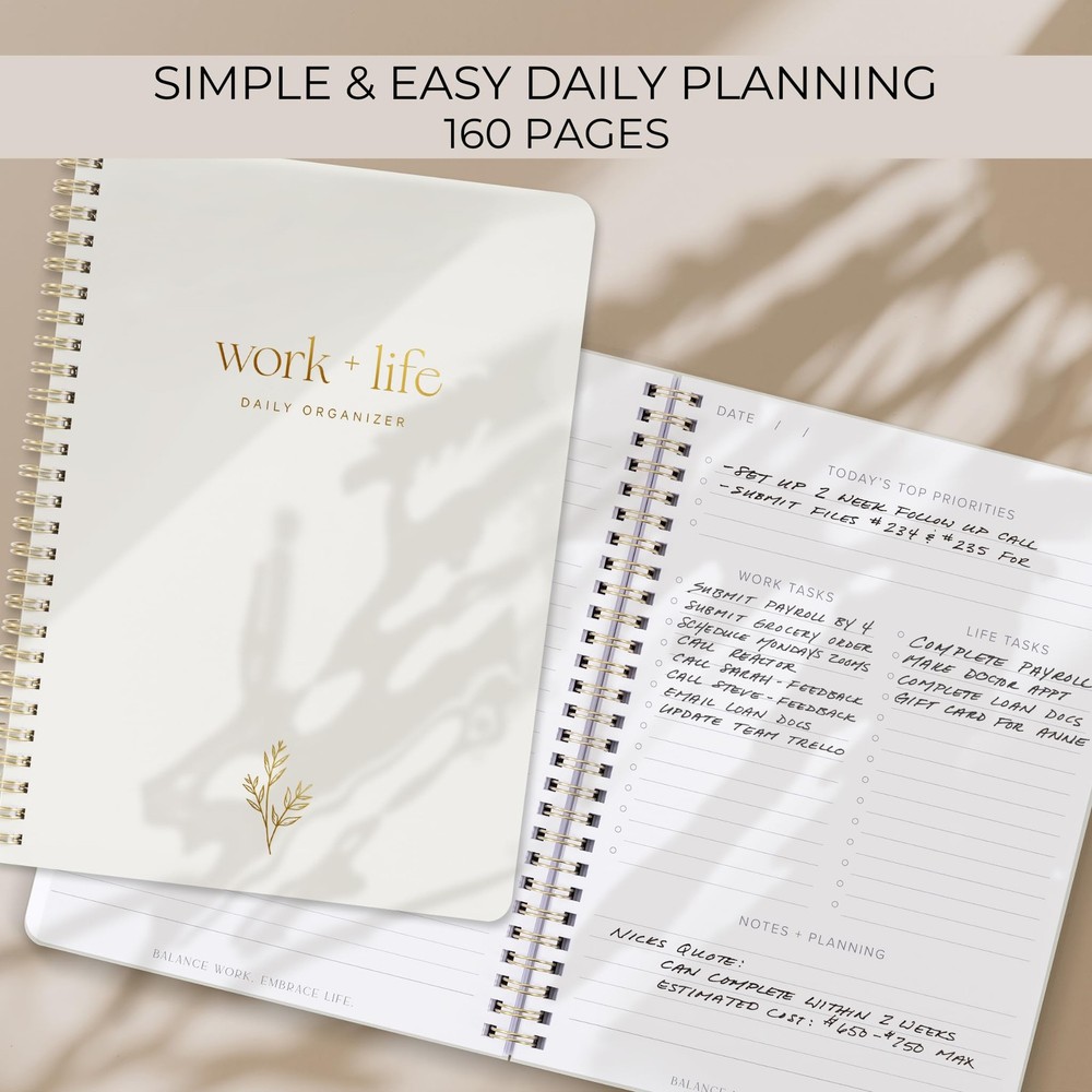 Work-Life Daily Planner by ZICOTO: Your journey toward a balanced, organized and fulfilling life starts here! ZICOTOs’ beautiful life and work planner - the ultimate tool for juggling work tasks and personal goals like a pro! The chic, undated daily planner is here to help you nail that perfect work-life balance, making every day a breeze to navigate with style and confidence. With its intuitive, clean layout, the day planner makes it super easy to focus and prioritize what truly matters. Use the to do list notepad to to get a clear overview of your daily to-dos in work and beyond and to highlight your key goals for the day and tackle them with confidence. It’s all about keeping your life organized while leaving space for spontaneity and joy. After all, life is meant to be lived, not just checked off a list - work-life harmony at its best! Boasting a stylish modern cover with shimmering gold foil accents and a sophisticated gold spiral binding, the to do list notebook effortlessly enhances your daily routine. Measuring a perfect 9.29 x 6.77 inches and packed with 80 sheets, it provides ample space for your thoughts and plans. Whether you're tracking essential tasks or jotting down what brings you joy, the daily journal invites you to embrace success and happiness, one delightful entry at a time. The undated format means you can jump in at any moment. The planner adapts to your rhythm and keeps you organized for whatever surprises come your way. Why wait? Start today to say goodbye to the chaos of overwhelming schedules and hello to a harmonious routine where work tasks and personal moments coexist beautifully. The undated planner invites you to embrace life’s little adventures while staying on top of your game! Find & Stay In Your Balance: Master the art of juggling work and life with ZICOTOs’ stylish undated daily planner! It allows you to manage work stuff and personal goals effortlessly, helping you to achieve work-life harmony and navigate each day with confidence Focus & Clarity - Get More Done In Less Time: Supercharge your productivity with the easy-to-use layout of the to do list notepad! Highlight top priorities in the day planner and tackle your tasks like a champ, freeing up time for the things you love most Beautiful Design for Daily Motivation: The undated planner features a timeless beige cover, shiny gold foil accents and a chic gold spiral binding, adding flair to your routine. The to do list notebook elevates your daily journal, aiming for genuine work-life balance Flexible To Start Anytime - It Fits Your Flow: Perfect for daily tasks, random bursts of ideas and everything in between, the undated life and work planner grooves to your life’s rhythm, keeping you organized and ready for whatever the day throws your way! Ample Space to Reflect & Organize: Sized at 9.29x6.77” with 80 sheets, the daily organizer offers ample room to jot down thoughts, plan your day, track must-do’s and what makes you happy. It’s the ultimate to do list notebook for cultivating joy and success!