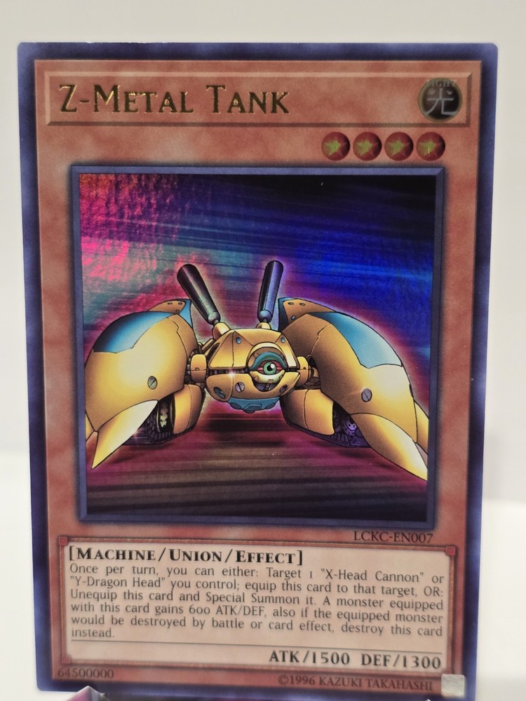 The Z-Metal Tank LCKC-EN007 card is a Light-type Machine monster from the Legendary Collection Kaiba set in the Yu-Gi-Oh! TCG. This Ultra Rare card has a Defense/Toughness of 1600 and an Attack/Power of 1500. It features a unique ability to either equip or unequip itself to target monsters, granting them 600 ATK and DEF and destroying the card instead of the equipped monster if it would be destroyed by battle or card effect. Manufactured by Konami as an English language card, Z-Metal Tank is a valuable addition to any Yu-Gi-Oh! card collection.