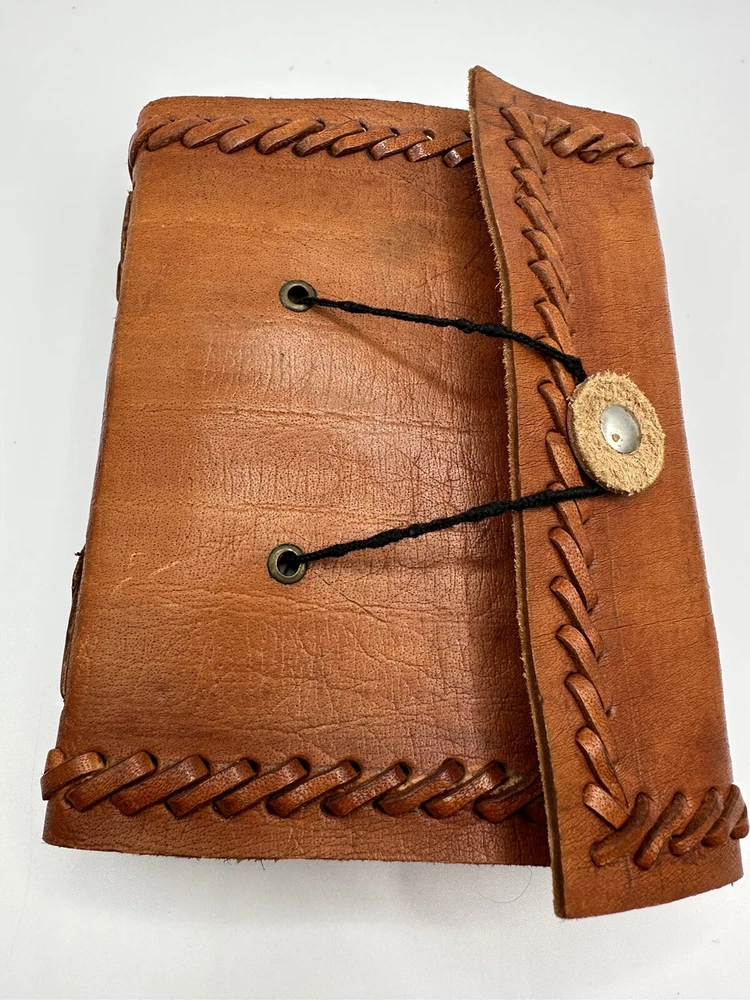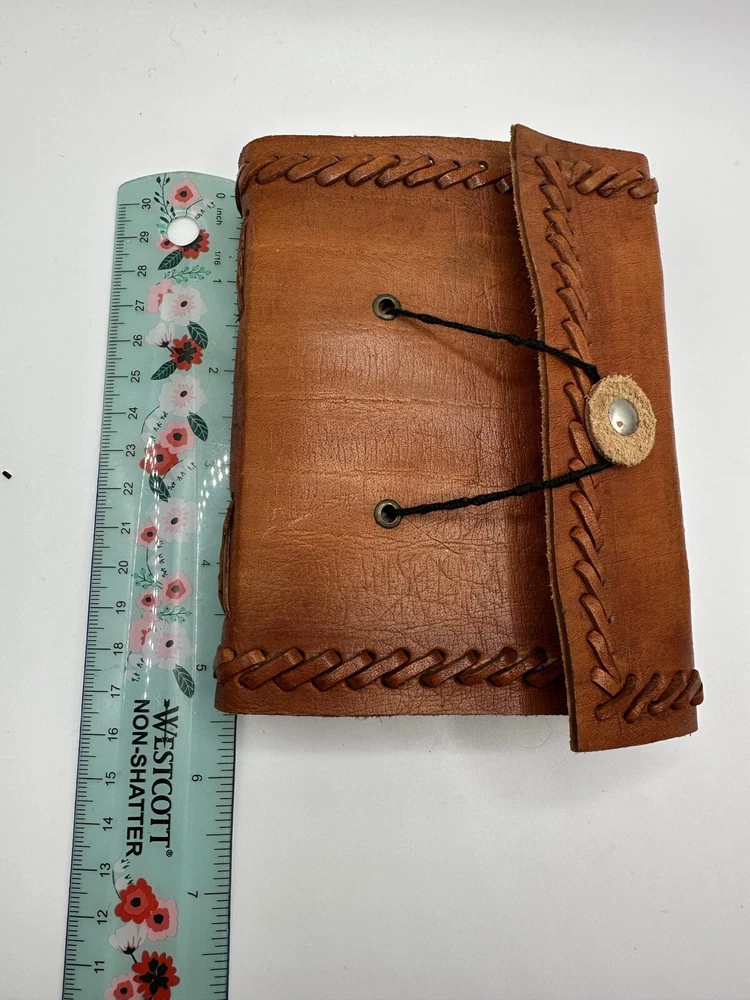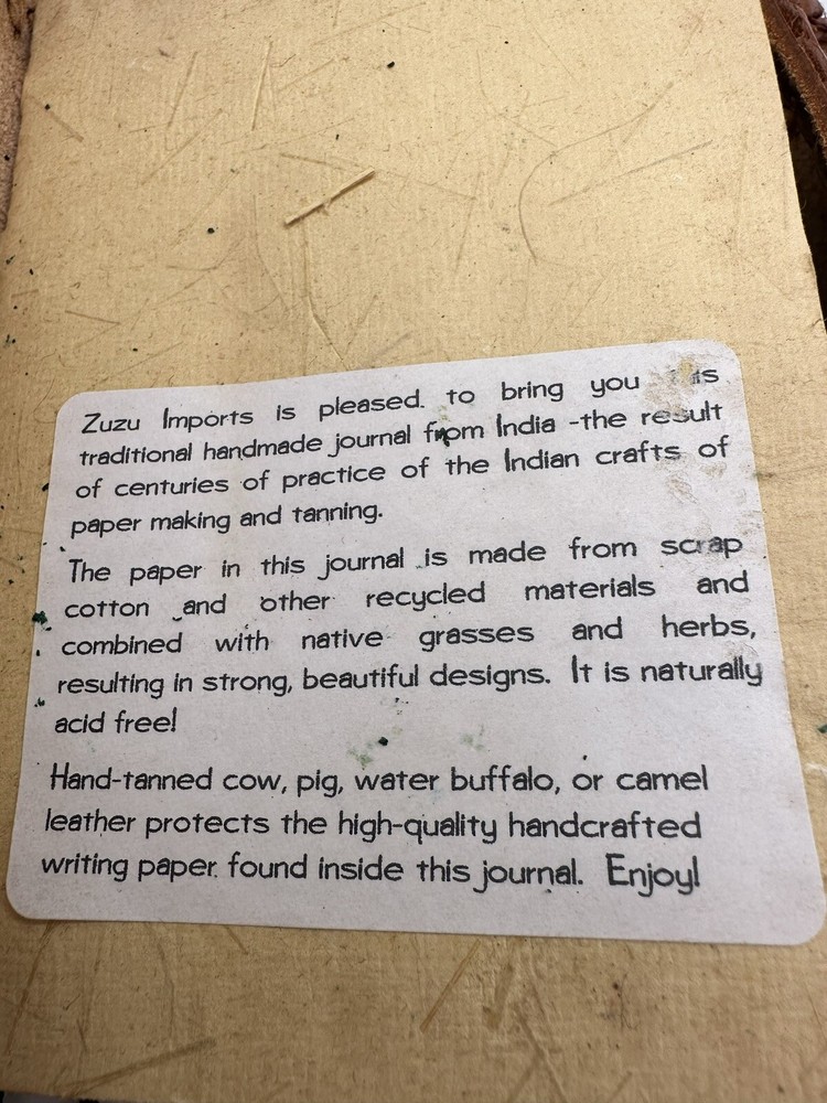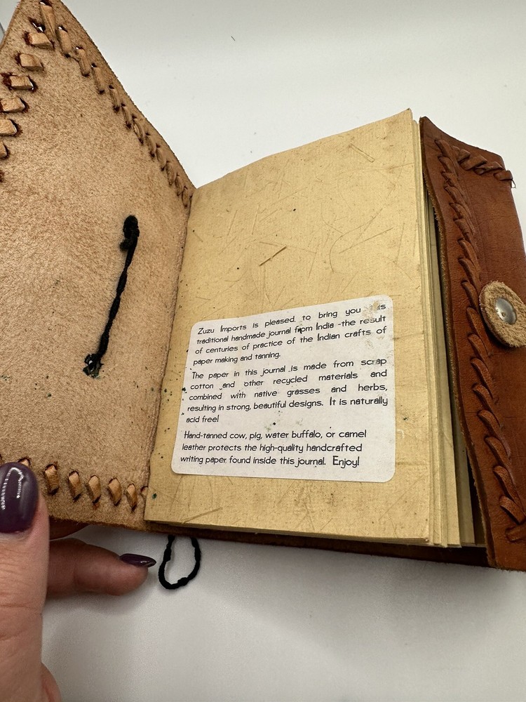 Zuzu Imports Indian Journal Leather Bound Han-Tanned Recycled Material - Zuzu Imports - Traditional handmade journal made from India - Paper is made from scrap cotton, native grasses and herbs. - Hand-tanned cow, pig, buffalo or camel leather bound - Never used - 5" - EXCELLENT CONDITION No stains, marks or tears - Returns available within 30 days of purchase - 1 day handling time FAST SHIPPING