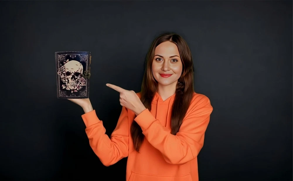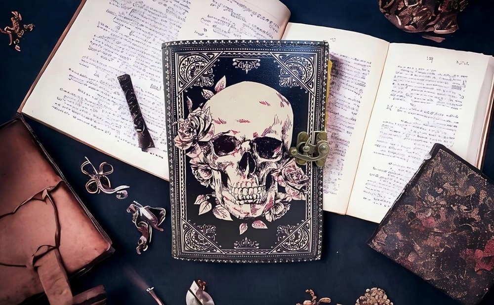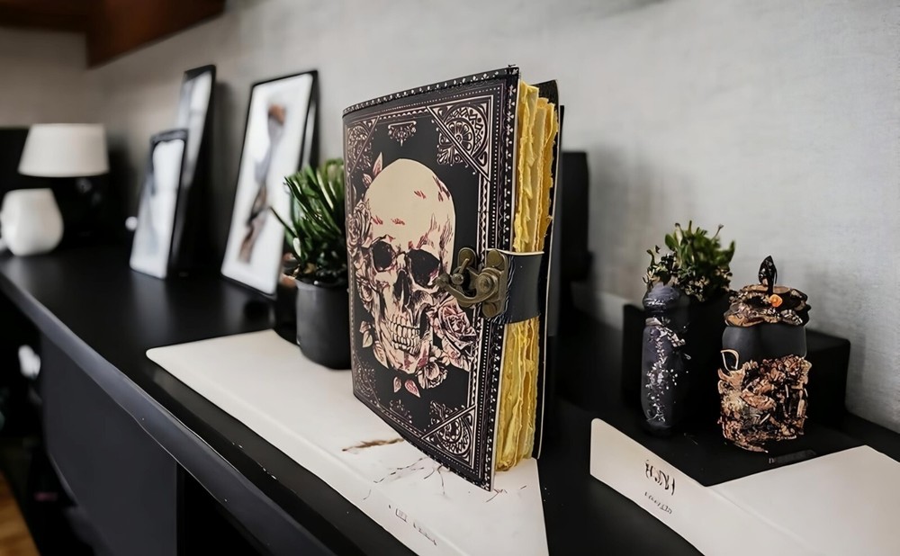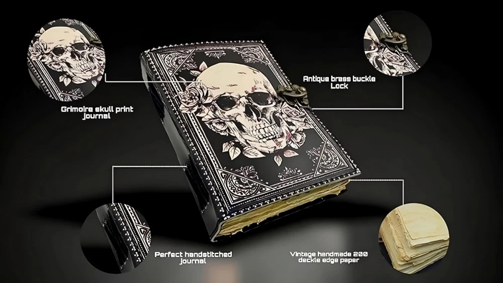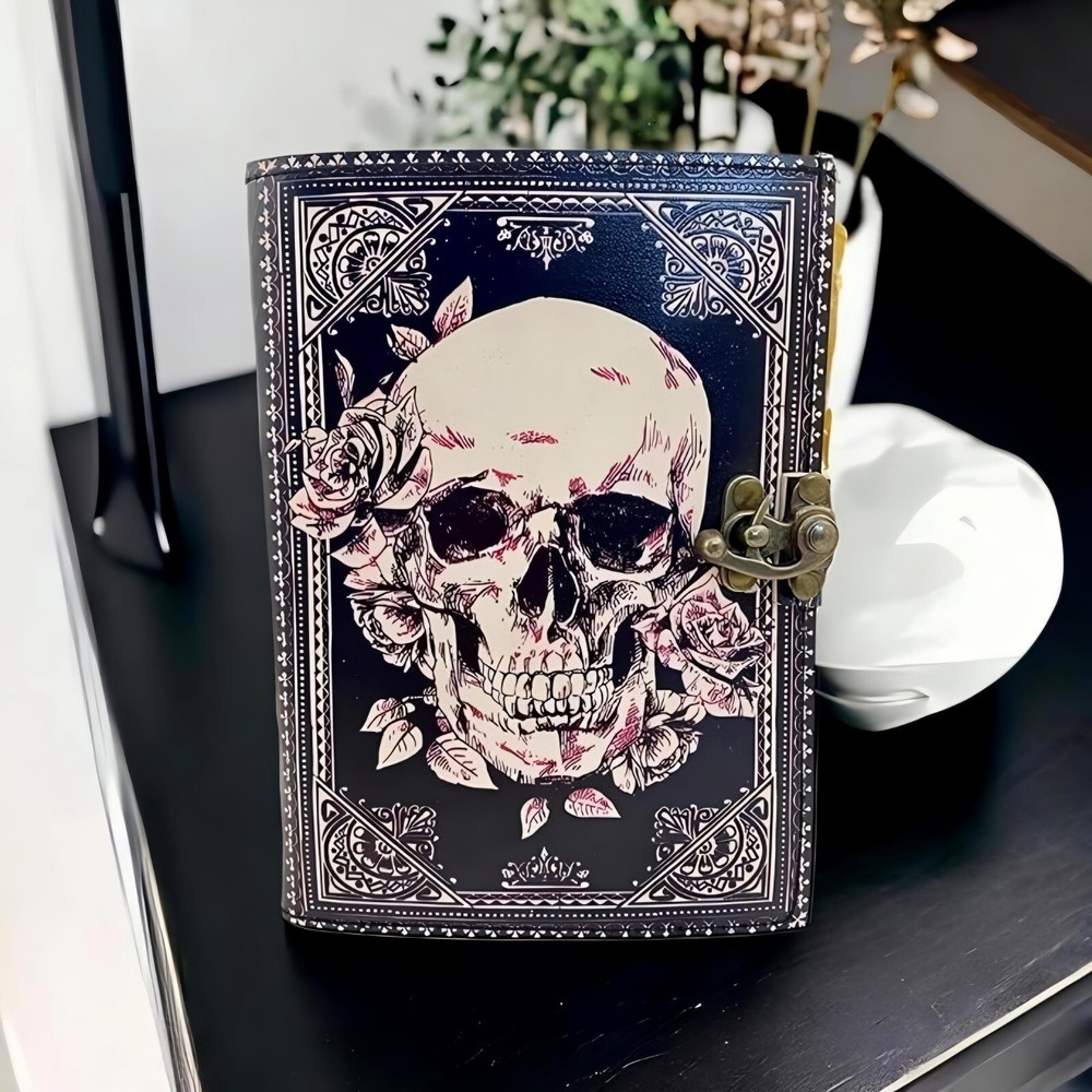 ✅BEAUTIFULLY CRAFTED: Our handmade artisan leatherbound spellbook grimoire journals are crafted from genuine leather. The black colouring gives it a beautiful antique vintage feel. Being hand-made from natural leather. The cover features a beautiful gold designing.. ✅VINTAGE LOCK AND STURDY BINDING - The vintage clasp lock will keep all your valuable writing locked inside.Sturdy hand stitched binding to make sure that no paper comes out loose from your Spell BOOK. ✅PERFECT FOR GIVING: Suitable for both men or women to write in, this locking diary daily travelers notebook is perfect for an avid writer, or Harry Potter fan looking for a magic spell book. Ideal to give as a birthday gift, valentines, halloween, graduation or wedding anniversary present. ✅Spell Book Tarot Journal Merchandise Popsocket Grimoire Wiccan Witch Prop Spells Decor Skull Lovers Blank Notebook Gift Props Spellbook Blanks With Clasp Coloring Books For Men Women Adult and you can keep this journal at your bedside as like memory of your loved ones.. ✅USE ANY KIND OF PEN - Size: 5"X7" This Gothic gifts Sketch, Doodle, Write on your Book with a Calligraphy Pen Fountain Pen, Brush Pen, Ball Pen, Acrylic Colours, Watercolor and many more. We guarantee no bleed through. SIZE - 5X7 Inch. ✅OUR PROMISE: We are positive you will love our products, but if you don't for any quality reason, we will replace or refund for up to 30 days after purchase. Our friendly customer service team are always available to answer any questions you might have. ✅MANY USES - This aesthetic Lovers Journal Can be used as a Hocus Pocus gifts , the lovers tarot journal, gothic notebook, skull journal, spell books halloween decorations, book of spells halloween decor. grimoire spell book, drawing or sketching and compact for carrying in your bag. Ideal for alternative Artist Sketchbooks, Photo Album, Traveling Notes, Business Executive, Logbook, hocus pocus spell book , Journalists, Food Planner, old spell notebook, antique handmade skull journal