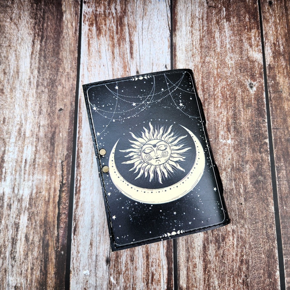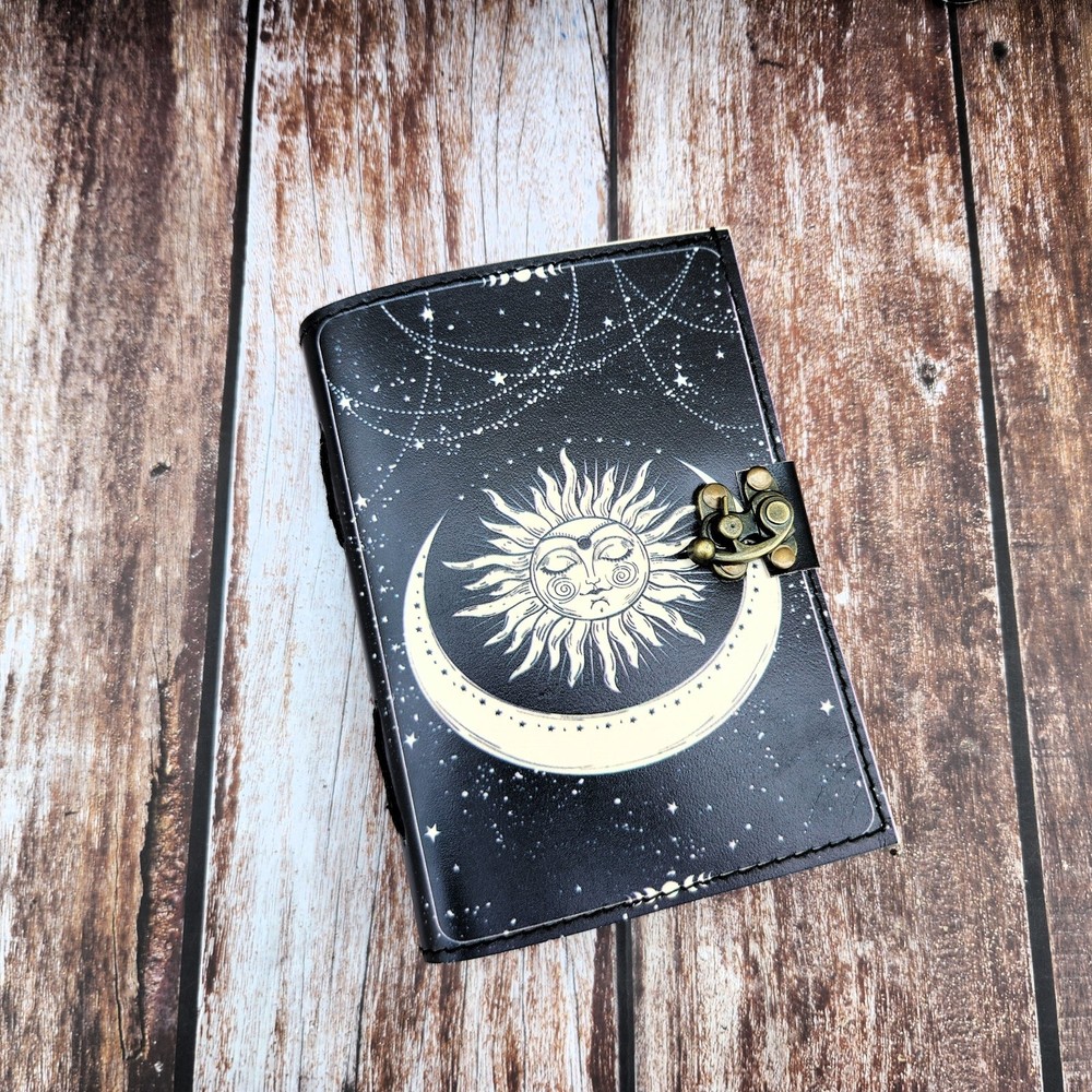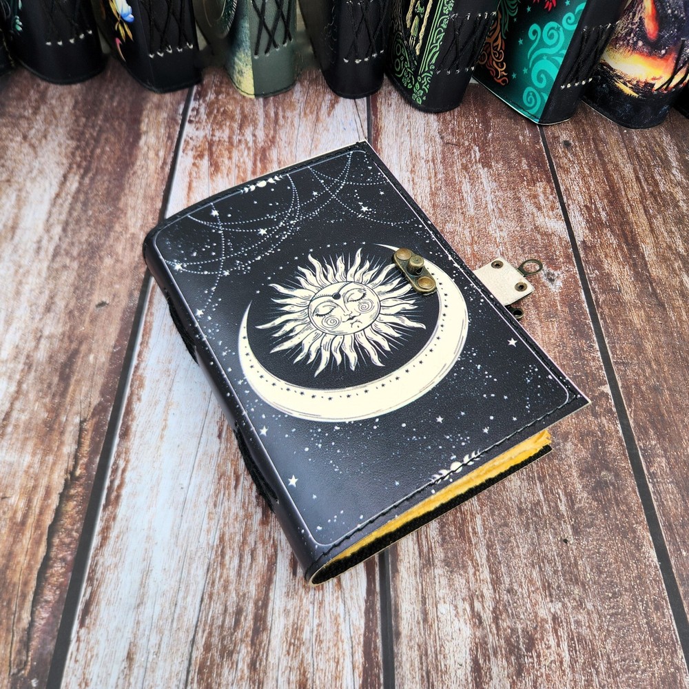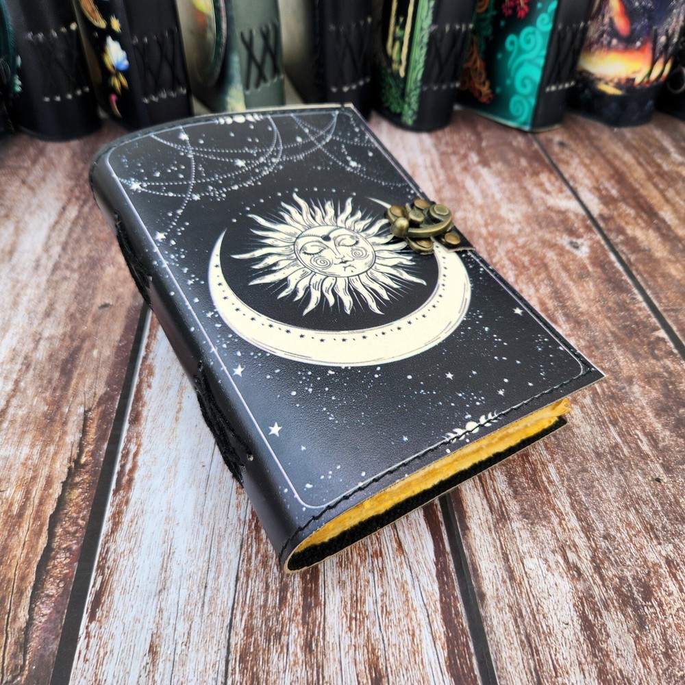 Introducing our exquisite black leather journal featuring a captivating sun and moon design. Crafted with the utmost attention to detail, this Leather Journal Moon & Star print design Journal is a versatile companion for all your writing needs. Whether you use it as a diary, notebook, sketchbook, or travel journal, its premium leather cover ensures durability and a touch of elegance. With 200 deckle edge pages, this personalized journal makes for a thoughtful and timeless gift. Unleash your creativity and indulge in the art of writing with this exceptional leather journal.