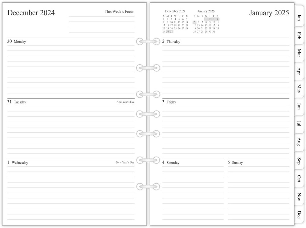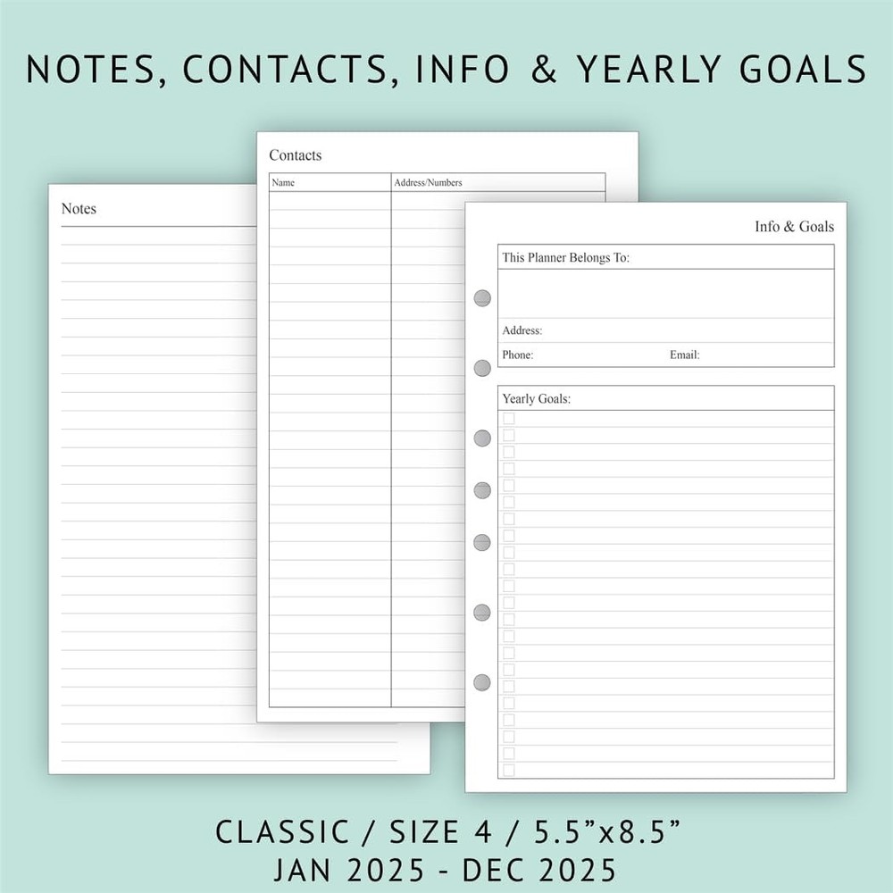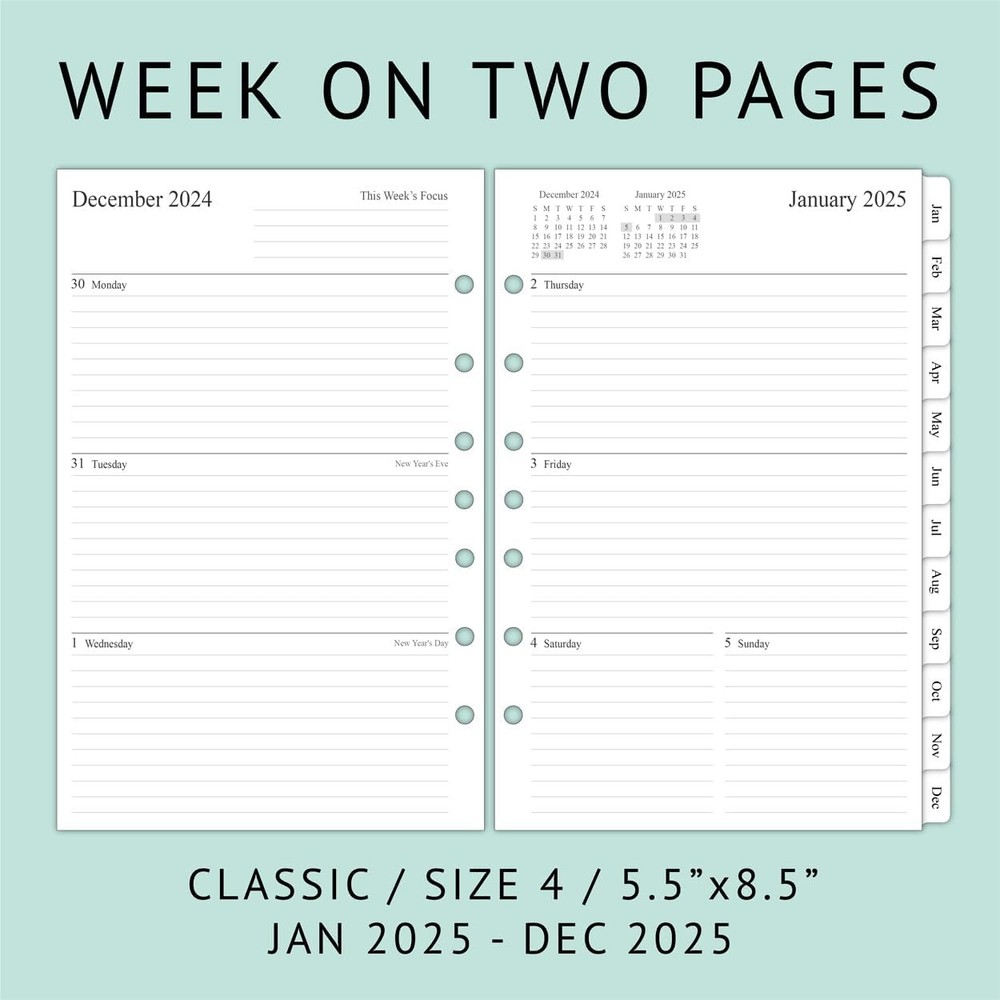 newestor 2025 Weekly & Classic (Size 4) - 5.5”x8.5“, White Product Details Manufacturer: September Leather Brand: newestor Item Weight: 8.1 ounces Product Dimensions: 8.27 x 6.1 x 0.39 inches Item model number: N19-R-A5-7 Is Discontinued By Manufacturer: No Color: White Cover Material: Paper Material Type: Paper Size: Classic (Size 4) - 5.5”x8.5“ Sheet Size: 5.5 X 8.5 Inches Manufacturer Part Number: N19-R-A5-7 Brand: newestor Color: White Cover Material: Paper Format: Day to Day Calendar Calendar Type: Weekly Target Audience: Adult Sheet Size: 5.5 X 8.5 Inches Material: Paper Item Weight: 0.23 Kilograms Binding: Ring-bound 2025 planner refills 5.5"x8.5" for 3-Ring or 7-ring mini binders (half letter size), Jan 2025 to Dec 2025 2 page monthly spread with ruled daily blocks, calendar & notes section, laminated month tabs to allow quick turning Weekly spread includes Week's Focus & 2-month calendar sections on the top and a Monday to Sunday format Feature: 2-year calendar & hollidays pages, contact, yearly goals, important days, contacts, and notes pages, extra 3-month spread pages for early planning (Oct 2024 to Dec 2024, No Weekly Pages) Compatible with Day Timer (desk size 7-ring binder), Franklin Covey (classic 7-ring binder), Avery (3-ring mini binder) Refill your 3 ring or 7 ring mini binders (5.5"x8.5") and keep organized with this 2025 weekly planner refills that feature coated monthly tabs, yearly goals, important dates, holidays and notes pages.