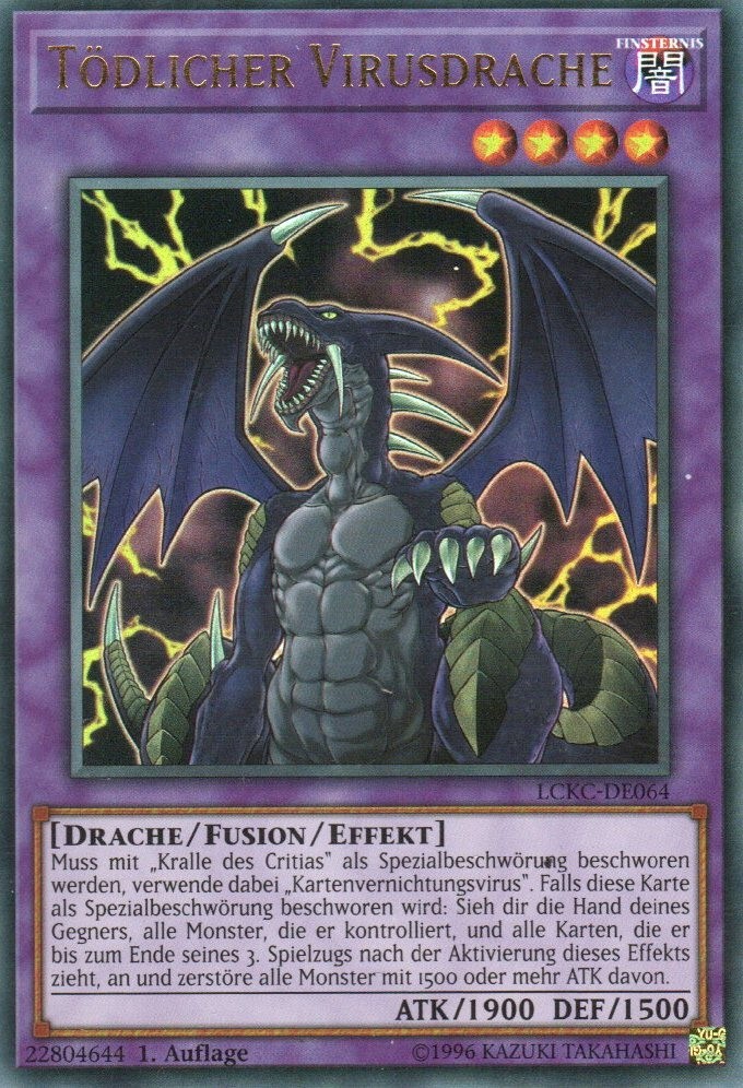 HALLO UND HERZLICH WILLKOMMEN ZU MEINEM ANGEBOT! HIER BERKOMMEN SIE DIE yugioh 1x Tödlicher Virusdrache LCKC-DE064 ULTRA RARE 1AUFLAGE DEUTSCH. Alle meine Angebote ( karten ) sind Original Konami und in einem guten Zustand. Versand Deutschland: Versand innerhalb von 2 Werktagen, Versand kostenlos per normalen Versand und 2,30€ per Prio Versand. Ausland: Versand innerhalb von 2 Werktagen, Versand 1,40€ ist 10€ Wert danach 5,00€ mit Versicherung. 3 2 1 DEINS