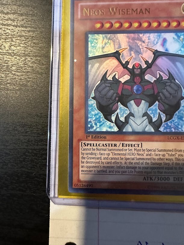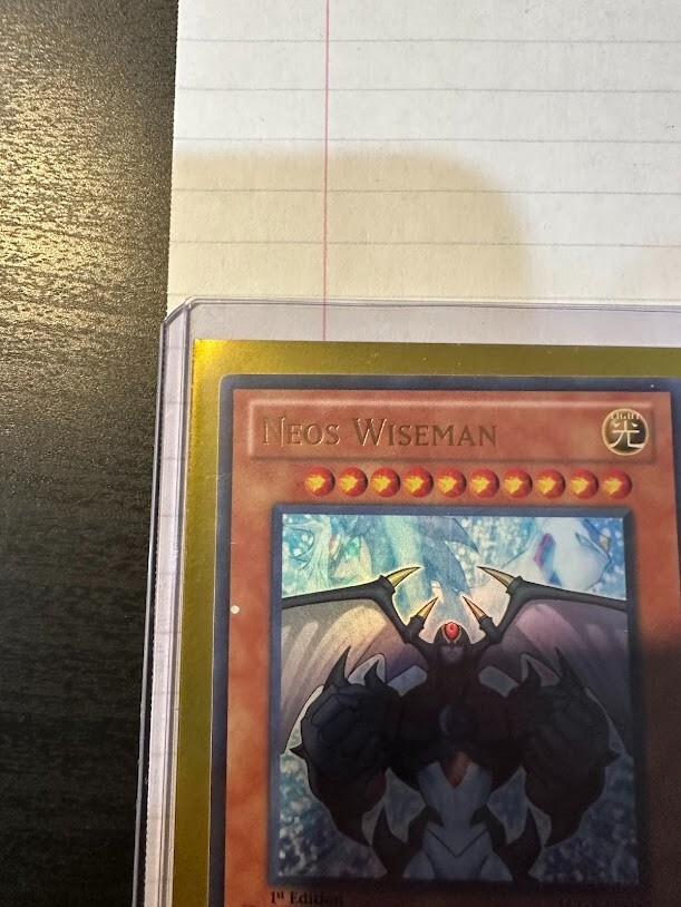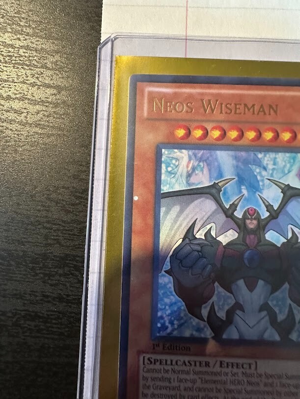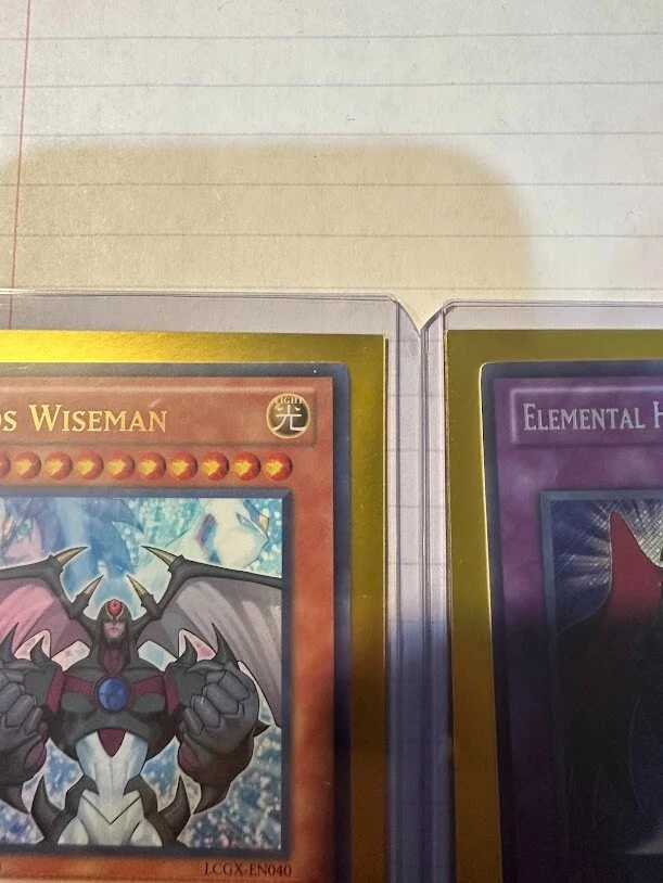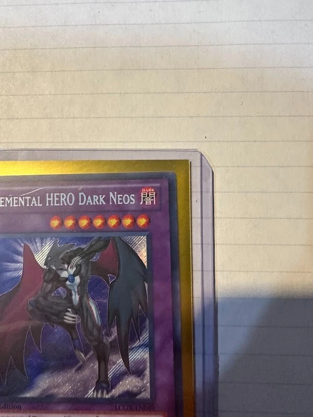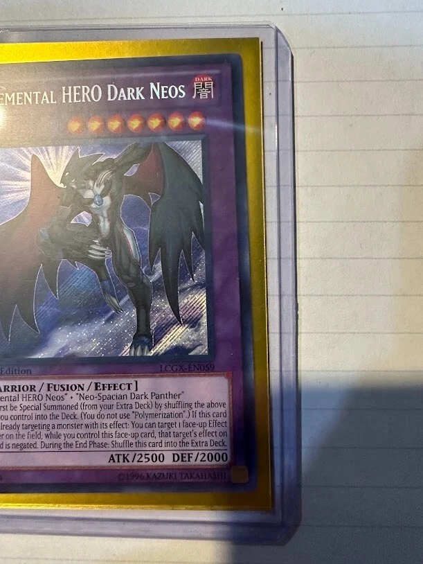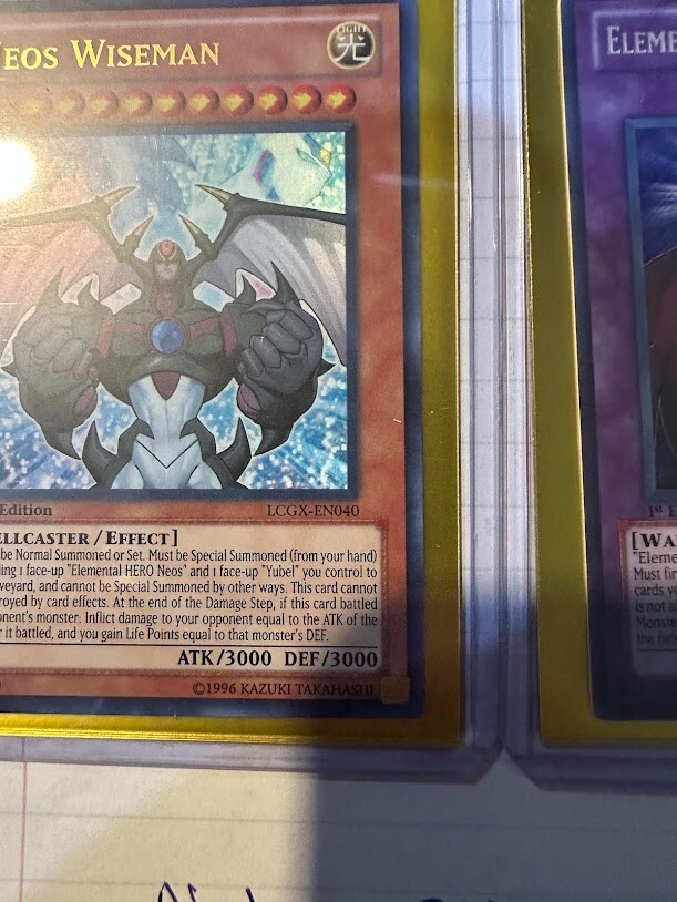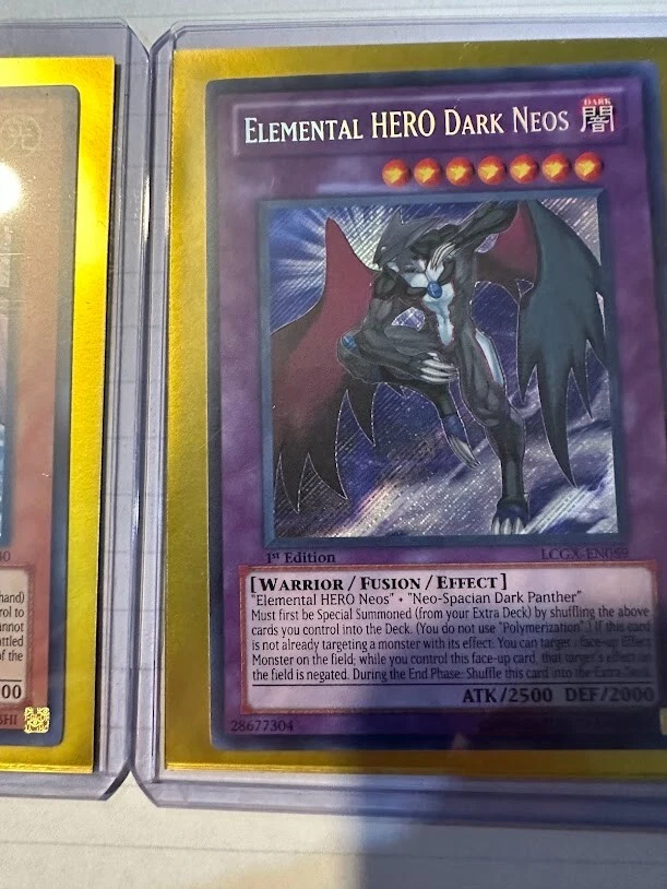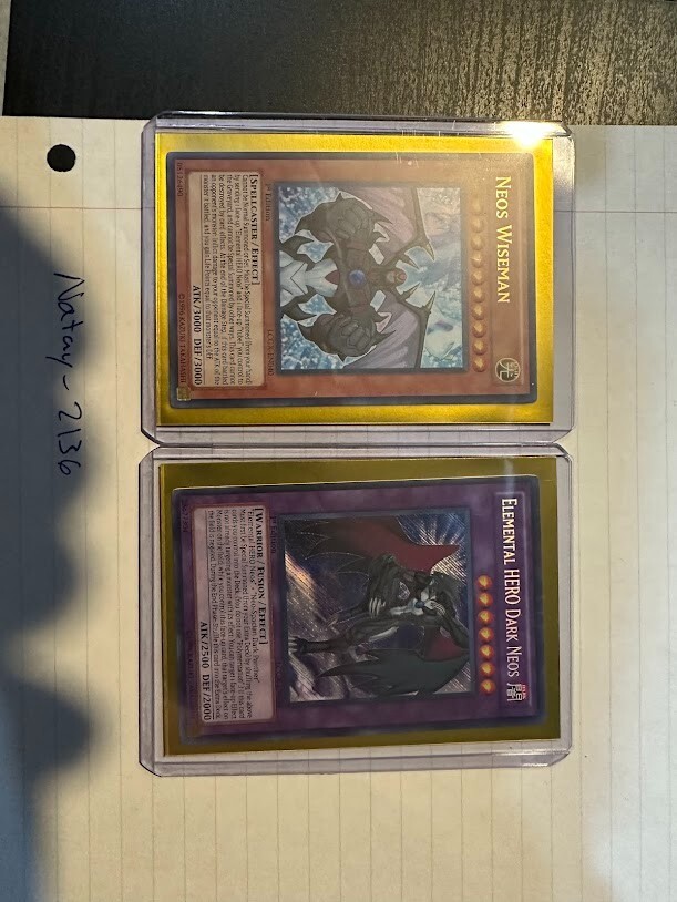 The product is a Yu-Gi-Oh! TCG card set from Legendary Collection 2 featuring the cards "Elemental Hero Dark Neos" and "Neos Wiseman." Cards are Dark and light attribute monsters, with Dark Neos being a Warrior and wiseman a Spellcaster type creatures. The cards are manufactured by Konami and are part of the game's collectible card series. Wiseman card does show a manufacture misprint as a perfect circle is cut out of the card as shown in the picture.